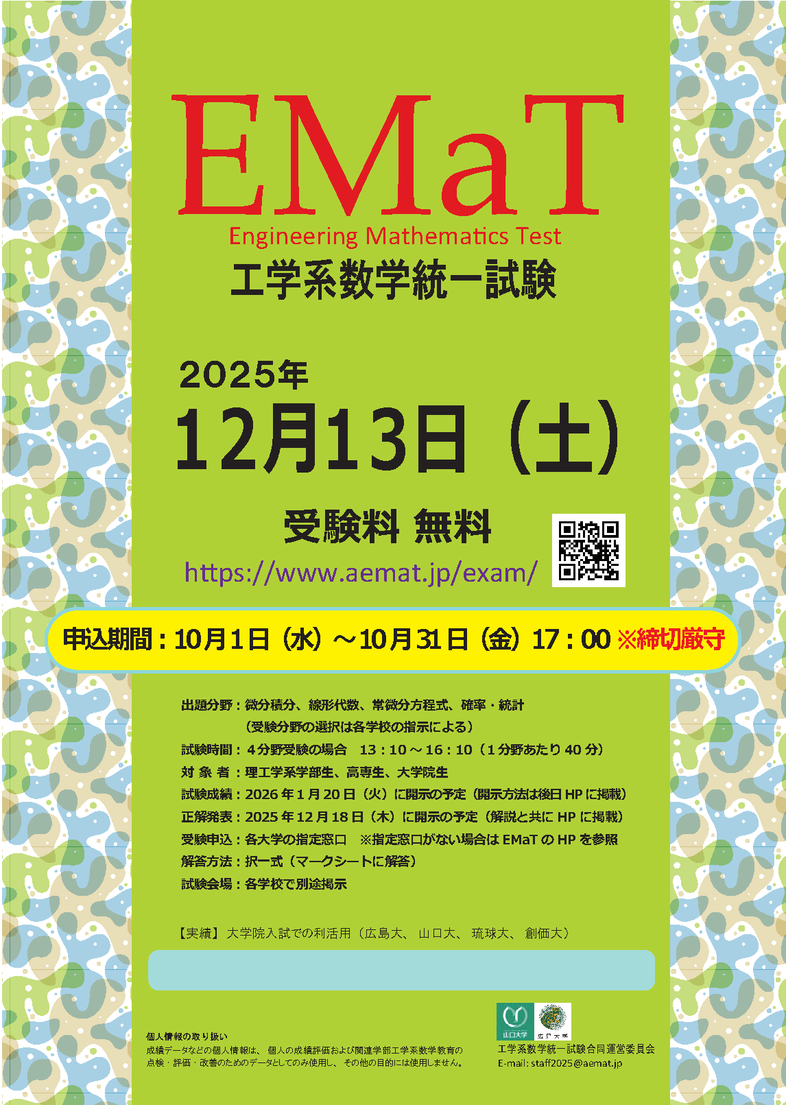 ポスターの送付を希望される学校関係者の方は、お気軽にEMaT事務局まで御連絡ください。 サイズは A2,A3,A4 の3種類があり、 無料で配布しております。送料も無料です。